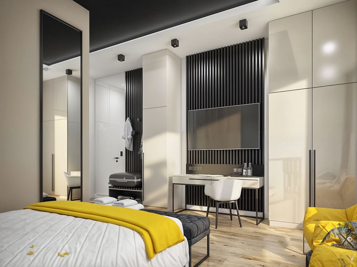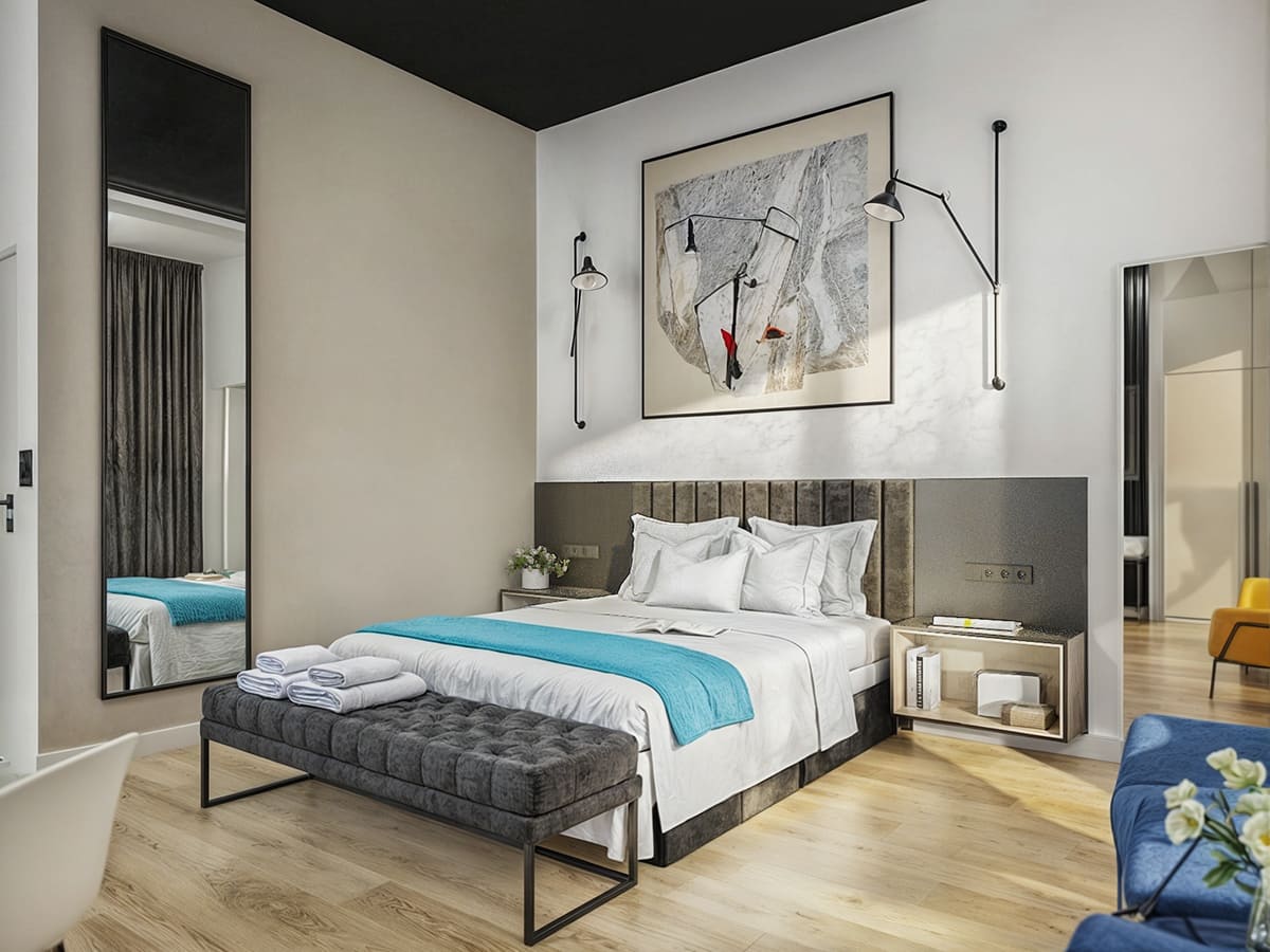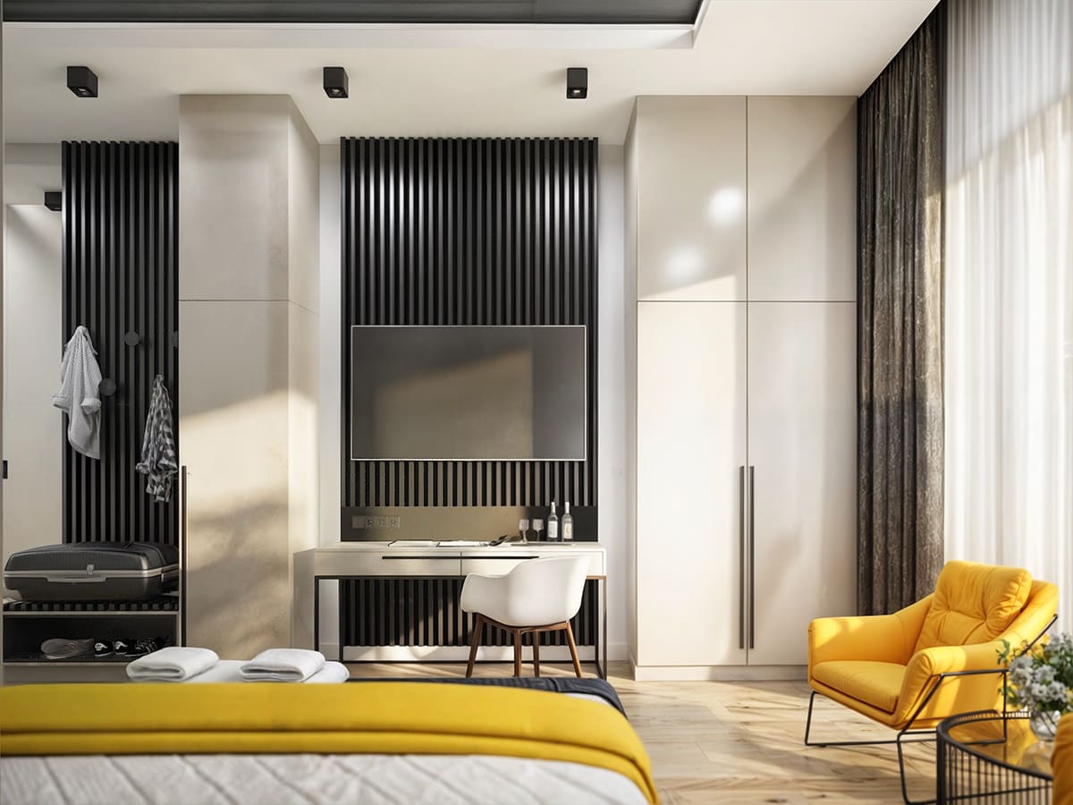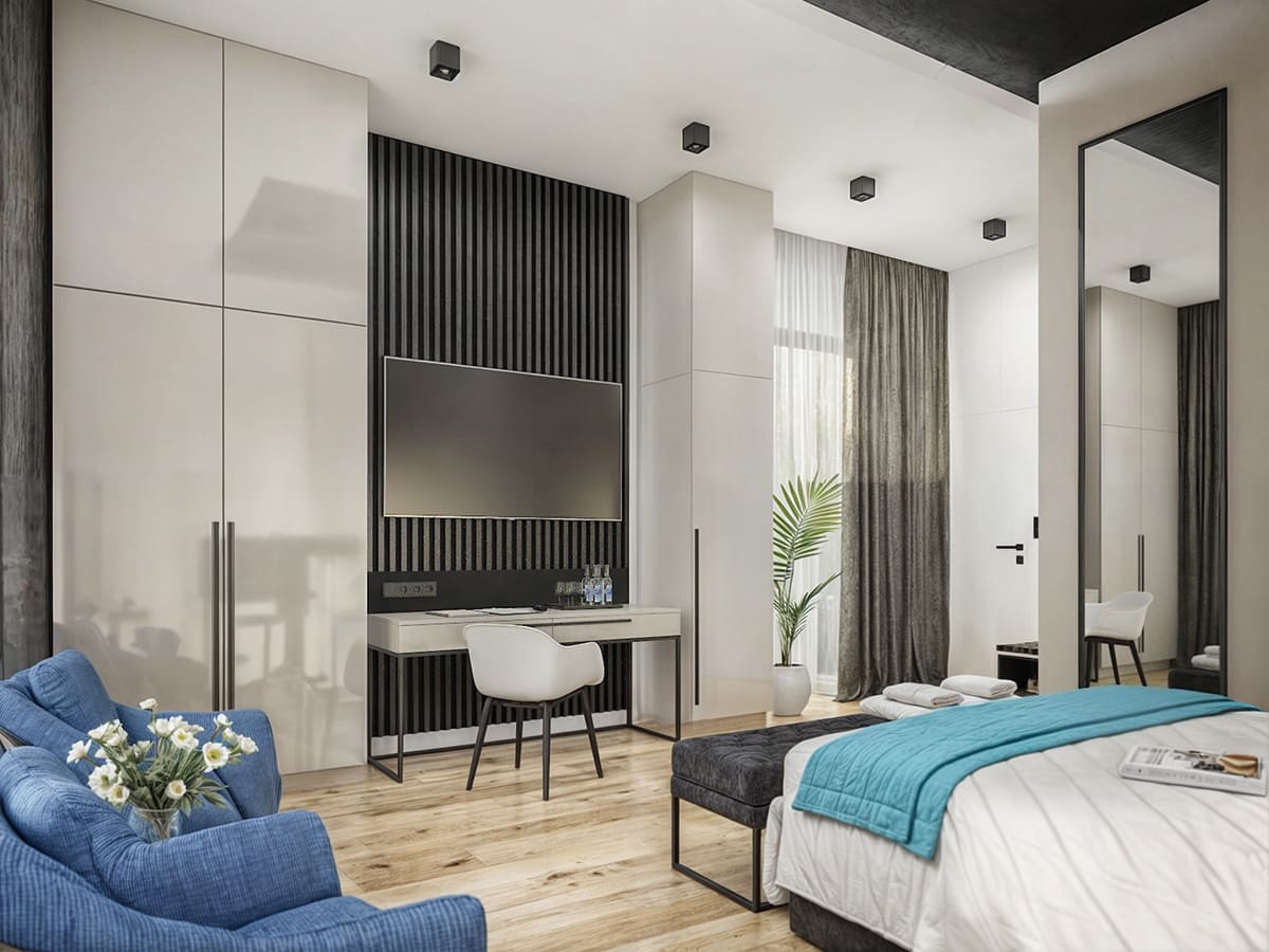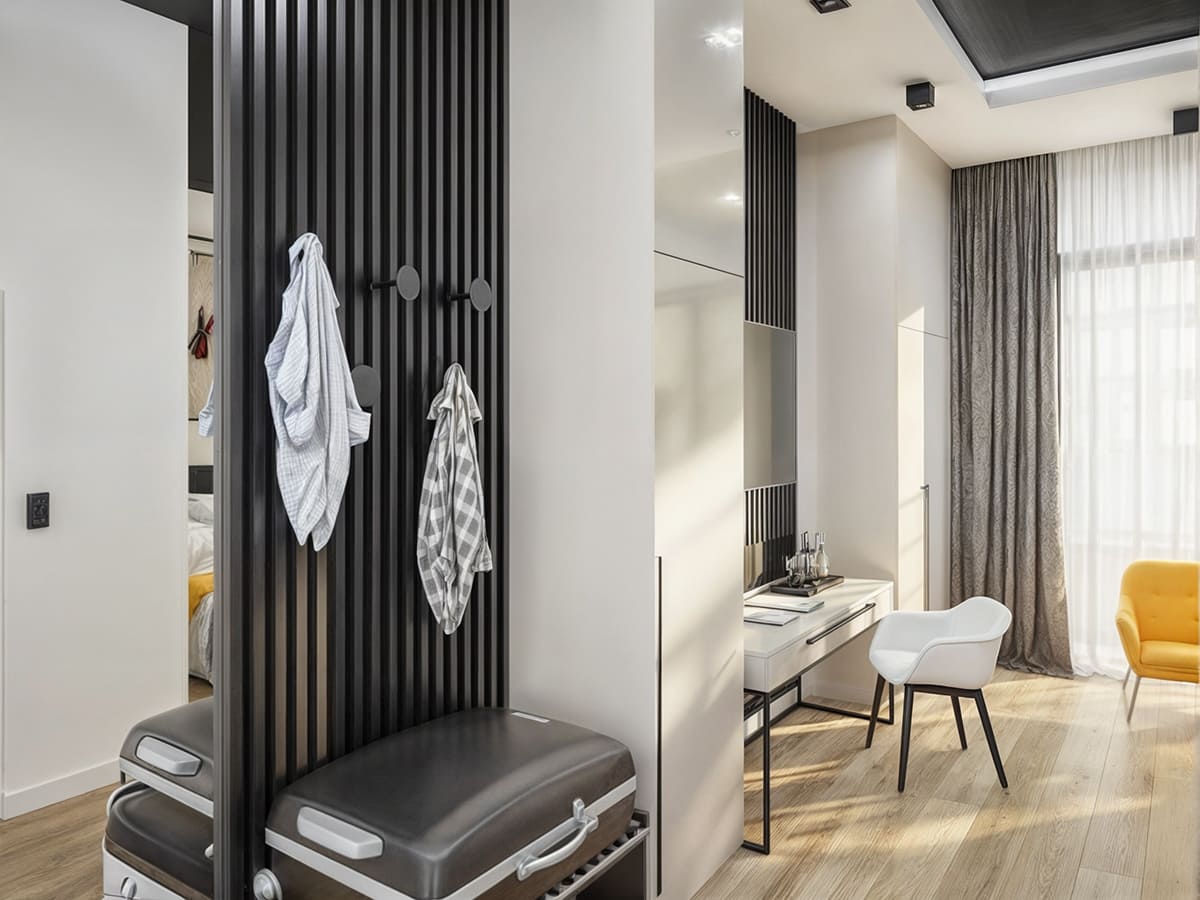 Projekt obejmuje trzy główne strefy: open space dla pracowników, salę konferencyjną oraz przestrzeń mieszkalno-hotelową. Kolorystyka i ergonomiczne rozwiązania wspierają twórcze myślenie, a każda z tych przestrzeni spełnia określone funkcje.