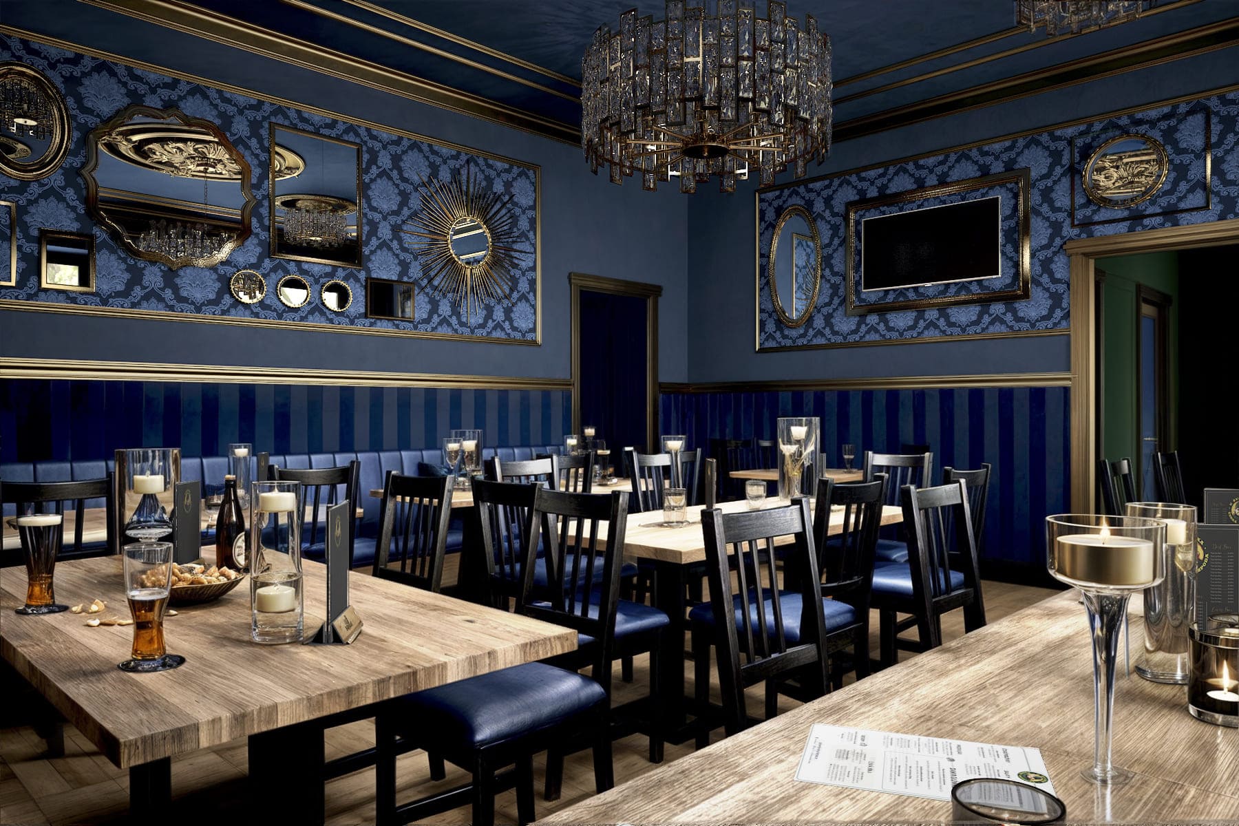 Granat i złoto to barwy, które od wieków symbolizowały potęgę i dostojność. Granatowe i niebieskie ściany oraz sufit stanowią eleganckie tło dla pozłacanych elementów dekoracyjnych.