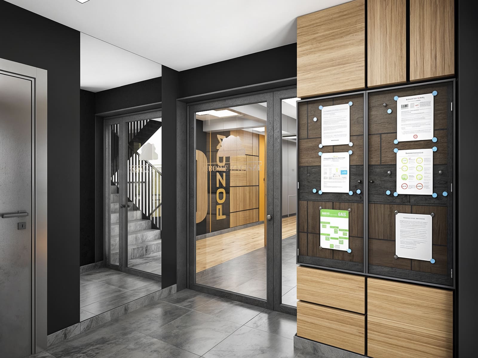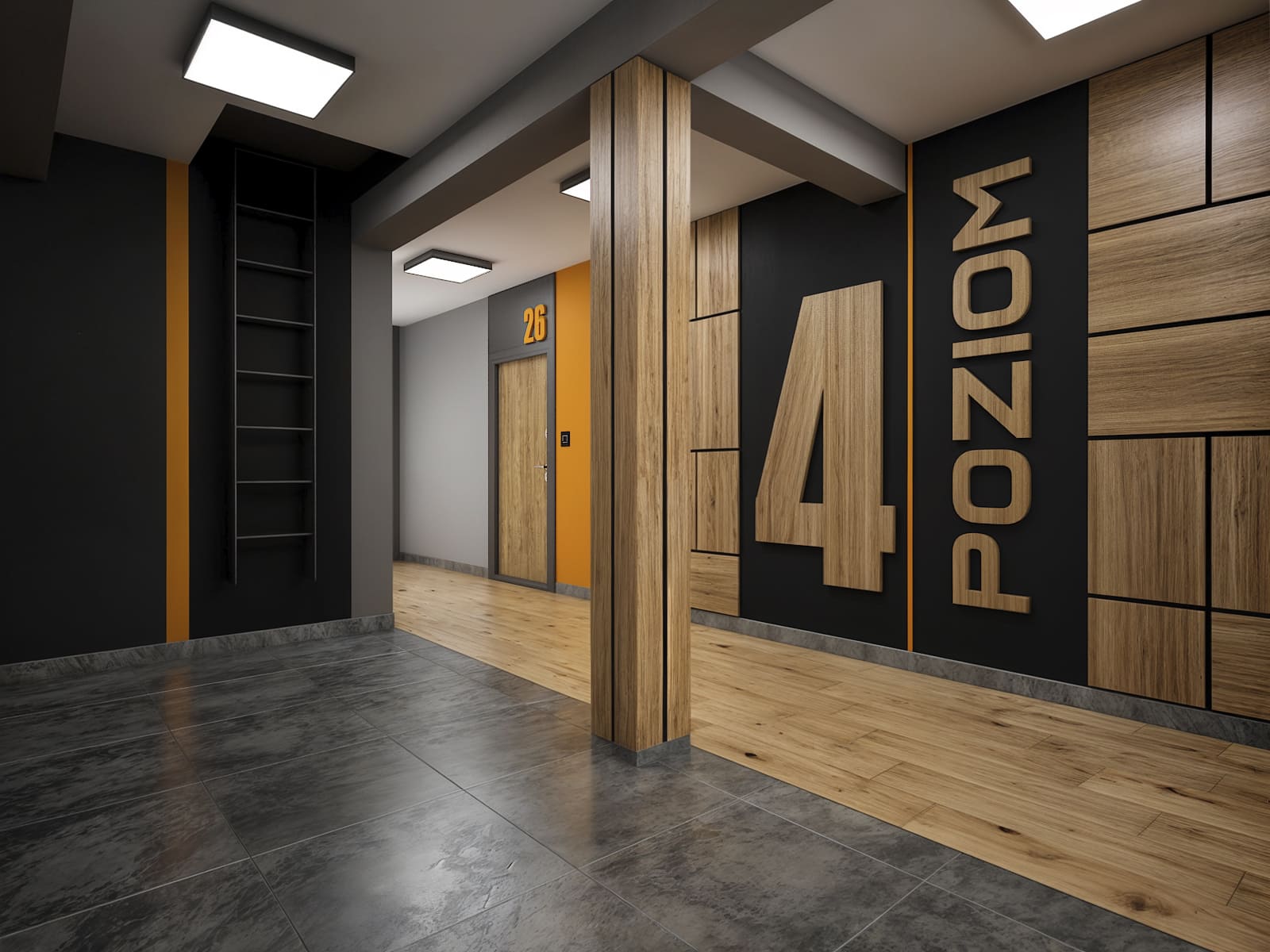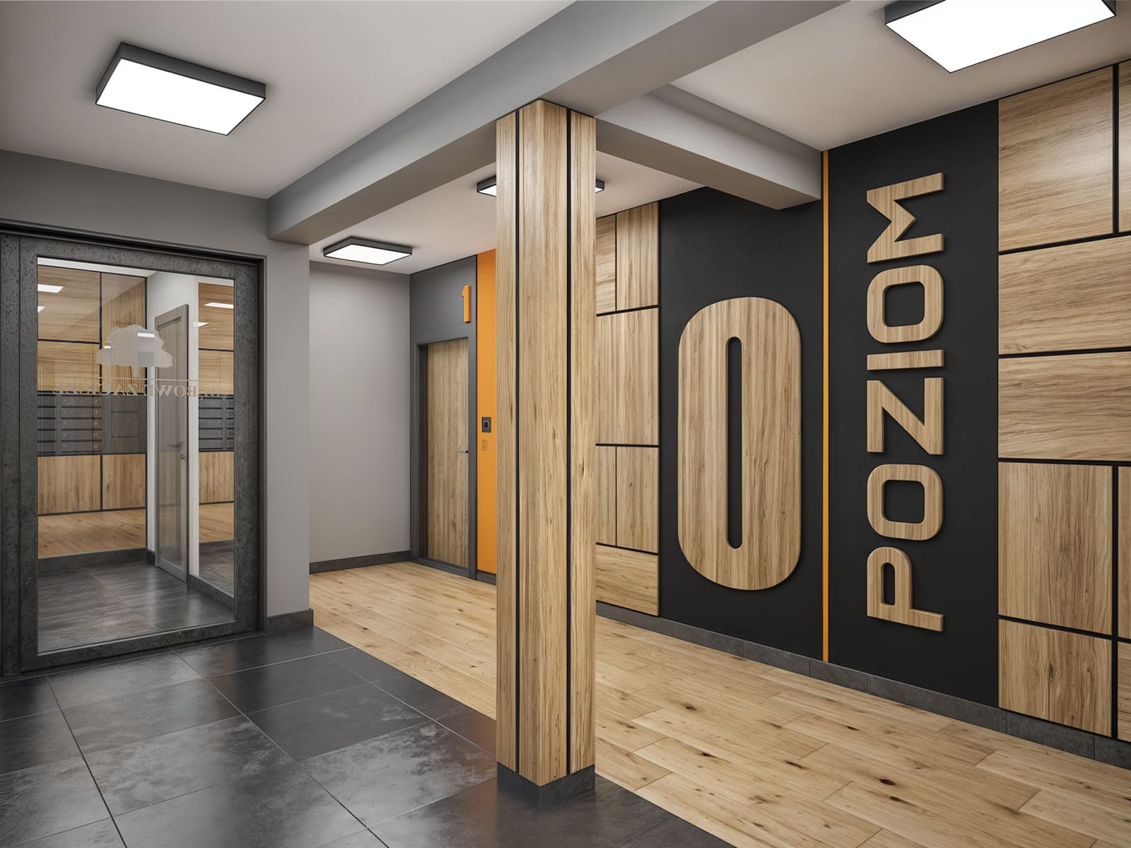 Zaprojektowane przez nas klatki schodowe stanowią przedłużenie mieszkań, eliminując nieprzyjemne skojarzenia z betonową surowością i lamperii malowanych olejną farbą. Dzięki użyciu płyt laminowanych drewnopodobnych w odcieniach naturalnego dębu oraz akcentom w kolorach czerni, szarości i pomarańczu, przestrzeń ta stała się przyjemniejsza w odbiorze i lepiej wpisuje się w estetykę całego budynku.
