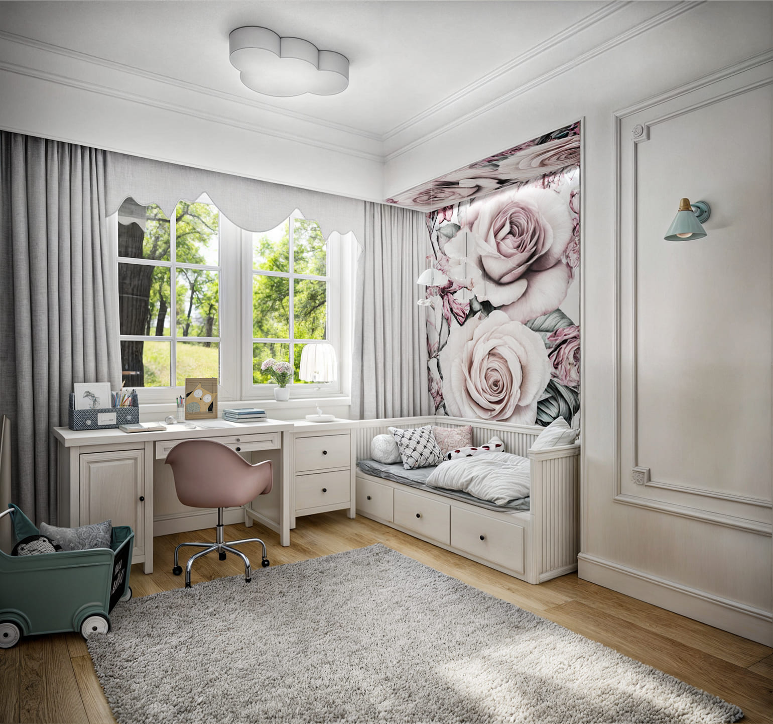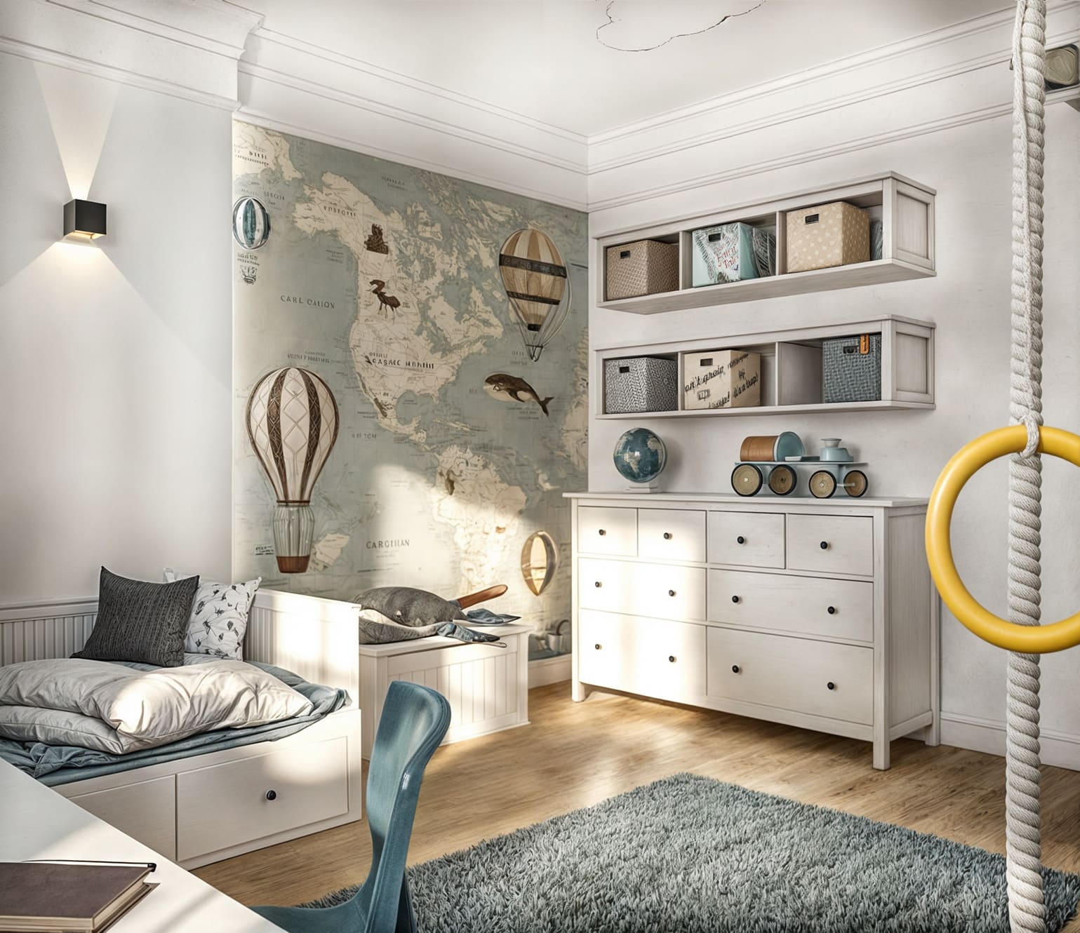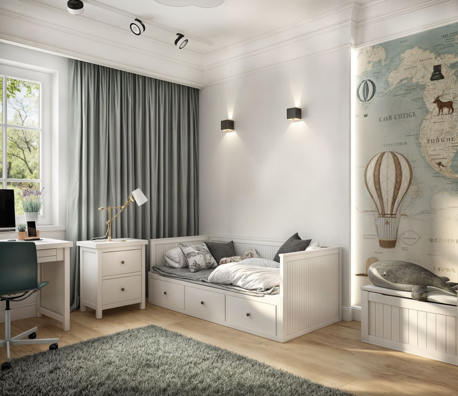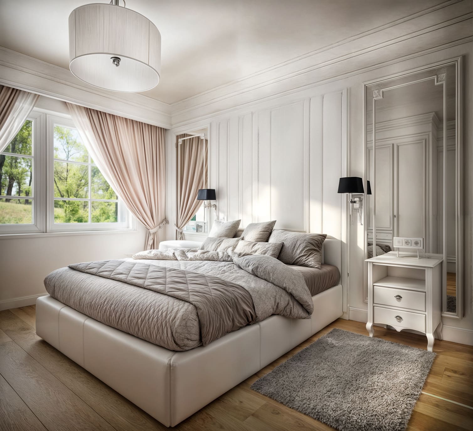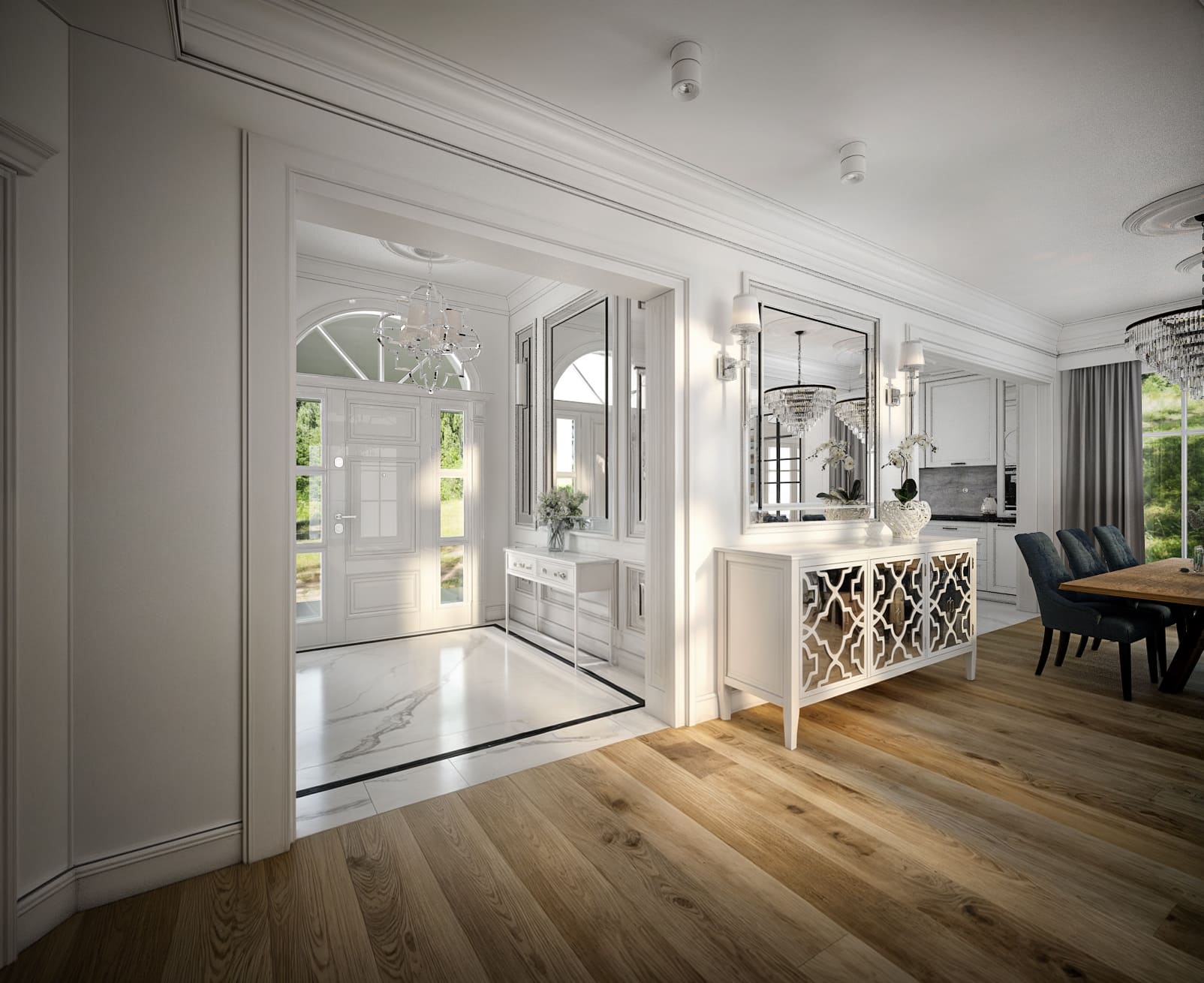 Wnętrza są zazwyczaj utrzymane w jasnych kolorach, które optycznie powiększają przestrzeń. Beże, biele, odcienie szarości, błękity i zielenie dominują w takim wystroju, pozwalając na stworzenie przestrzeni pełnej światła. Ciemniejsze akcenty, takie jak głębokie granaty czy bordo, są wykorzystywane do podkreślenia niektórych detali, takich jak meble czy elementy dekoracyjne.