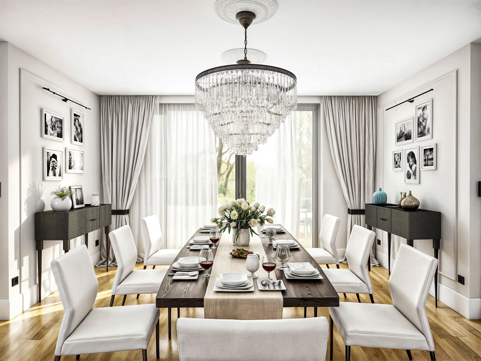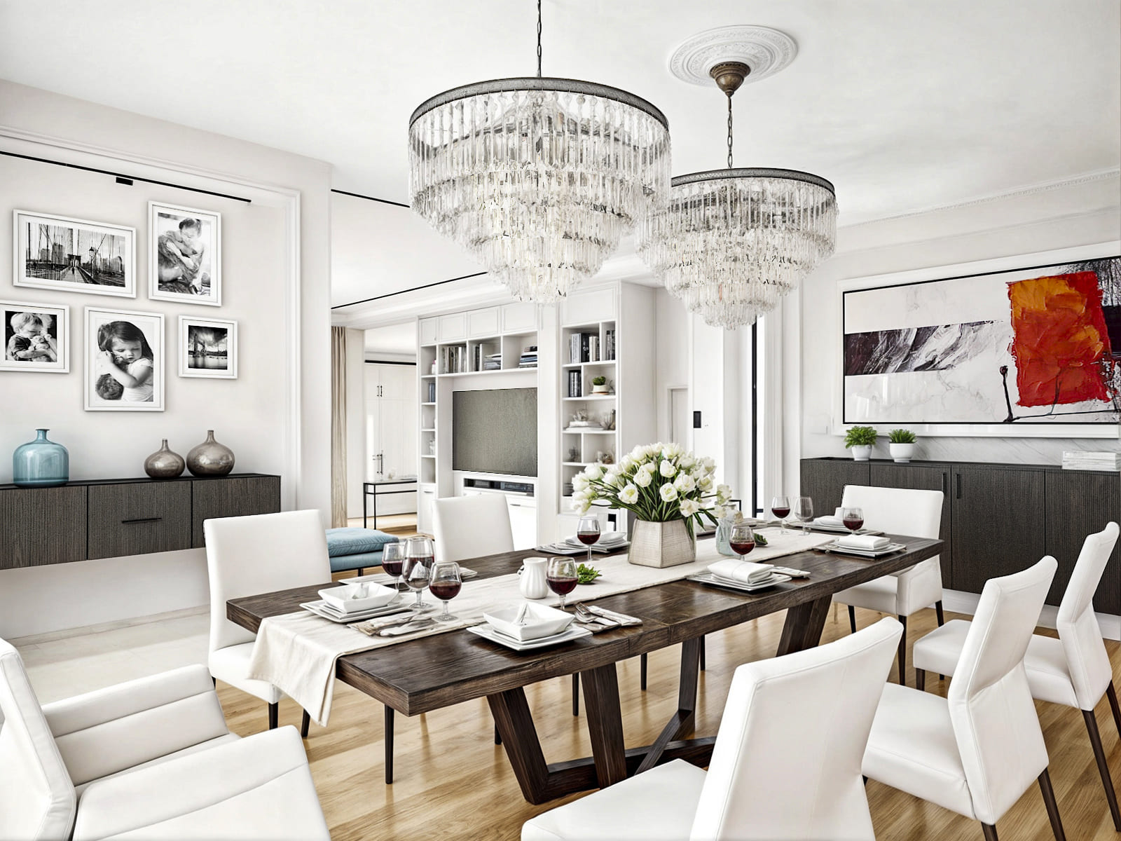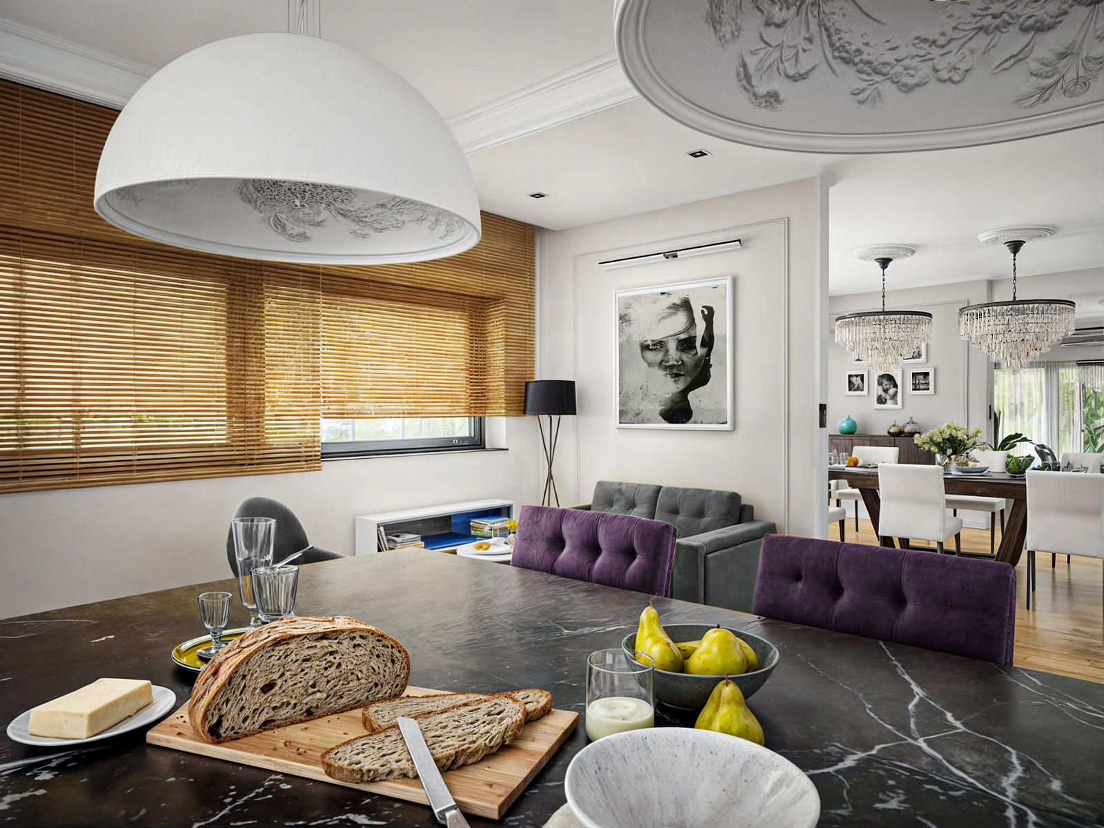 Ściany i sufity nie zostały potraktowane jedynie jako neutralne tło. Wykorzystano na nich sztukaterię, która nadaje wnętrzu rytm i głębię. Wpuszczane podtynkowe szynoprzewody zapewniają odpowiednie oświetlenie i wydobywają faktury zastosowanych materiałów. Oświetlenie w tym projekcie odgrywa szczególną rolę – kryształowe lampy zawieszone nad jadalnianym stołem są nie tylko źródłem światła, ale także elementem podkreślającym przestrzeń.