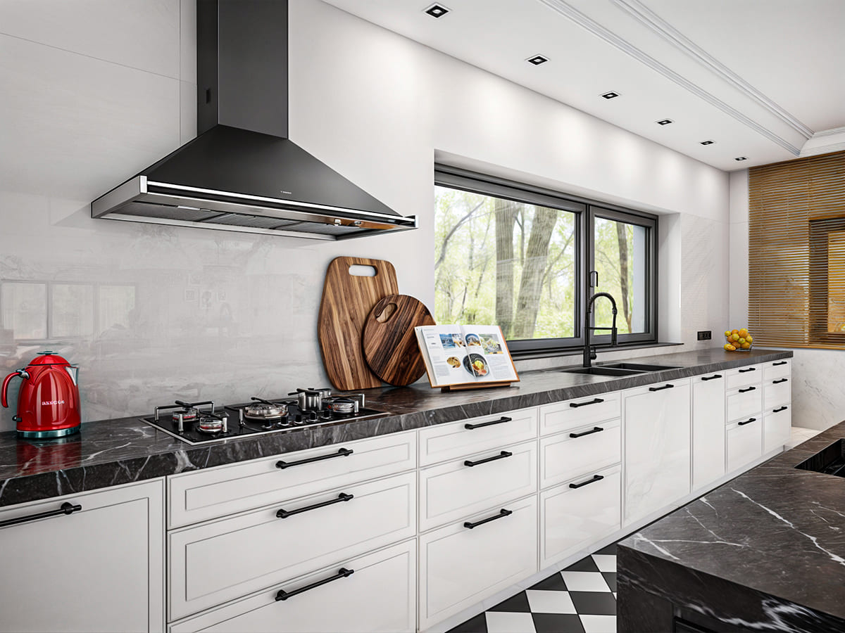 Kuchnia zyskała zupełnie inny charakter dzięki zastosowaniu czarno-białych płytek ułożonych w karo. Taki układ jest nie tylko odniesieniem do klasycznych europejskich rezydencji, ale także niezwykle praktycznym rozwiązaniem ułatwiającym utrzymanie czystości.