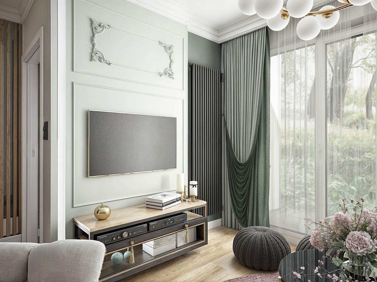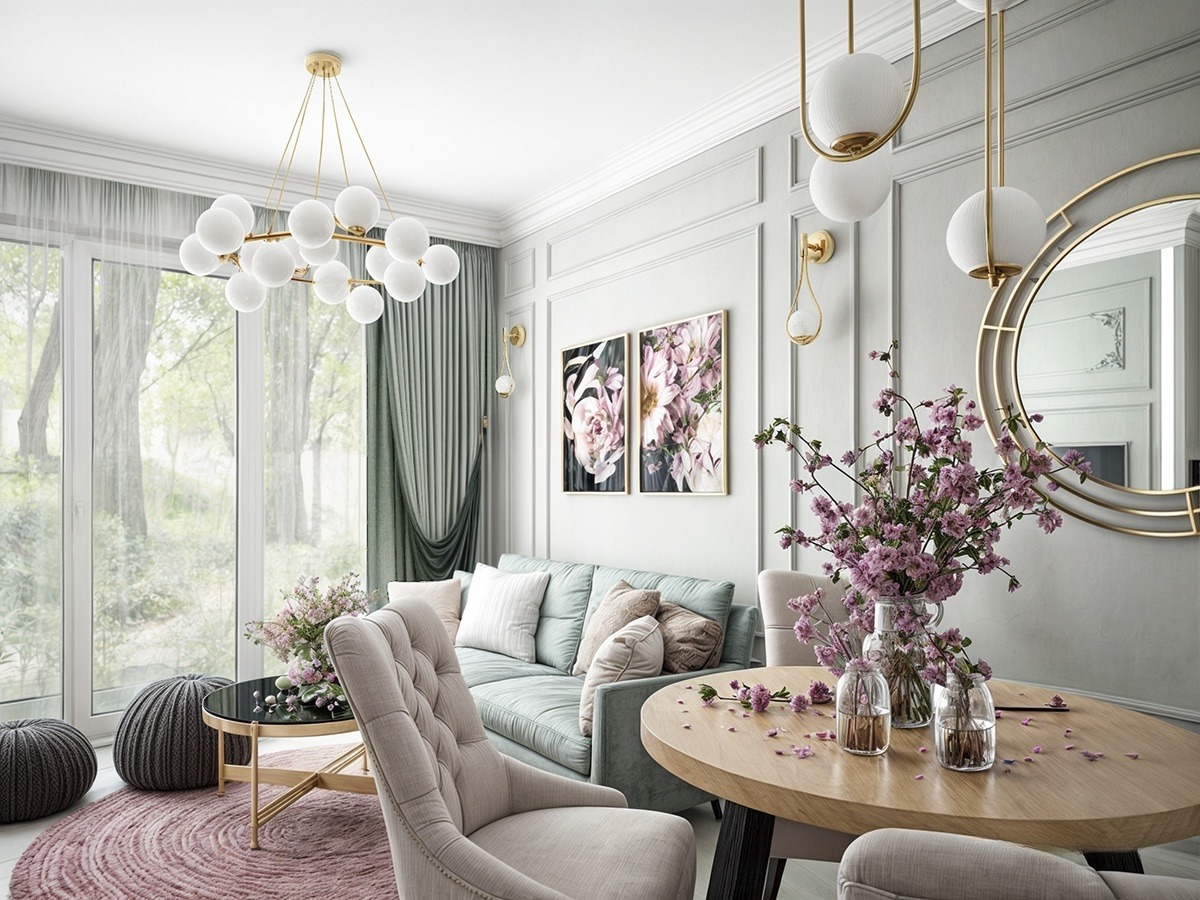 Wnętrza modern classic bazują na klasycznych formach i proporcjach. Symetryczne układy, ozdobne listwy sufitowe i meble o miękkich liniach to elementy, które nadają przestrzeni elegancji. Klucz tkwi jednak w balansie — tradycyjne akcenty przełamane są nowoczesnymi materiałami i prostymi dodatkami. Przykładem może być pikowana sofa zestawiona z metalowym stolikiem o geometrycznym kształcie. Takie kontrasty nadają pomieszczeniom świeżości i indywidualnego stylu.