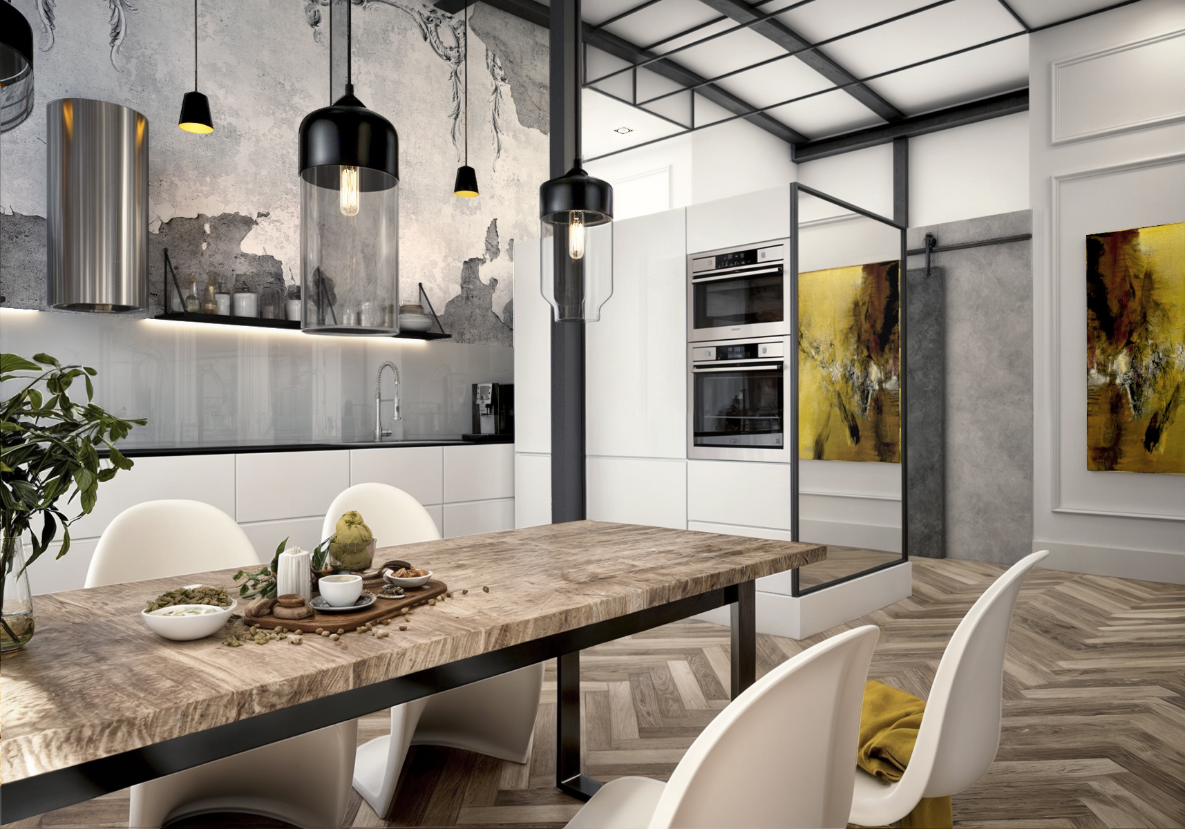 W kuchni postawiliśmy na nietuzinkowe rozwiązanie – za prostymi, białymi meblami zaprojektowaliśmy fototapetę imitującą stary, nierówny tynk, który wprowadza dodatkowy wymiar i teksturę. Aby przełamać surowość tej przestrzeni, wprowadziliśmy subtelną sztukaterię na ścianach – detal, który delikatnie równoważy industrialny klimat wnętrza, nadając mu elegancji i lekkości.