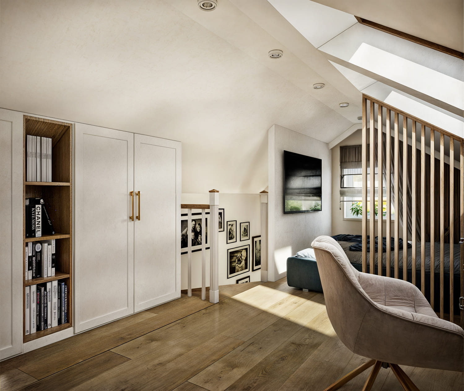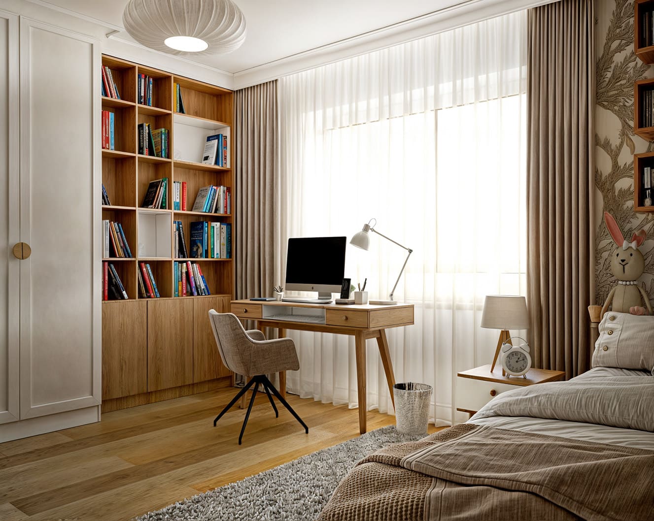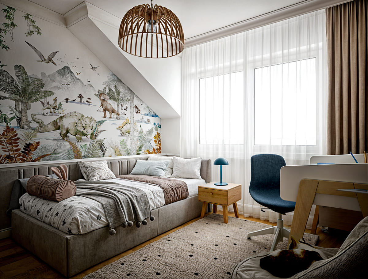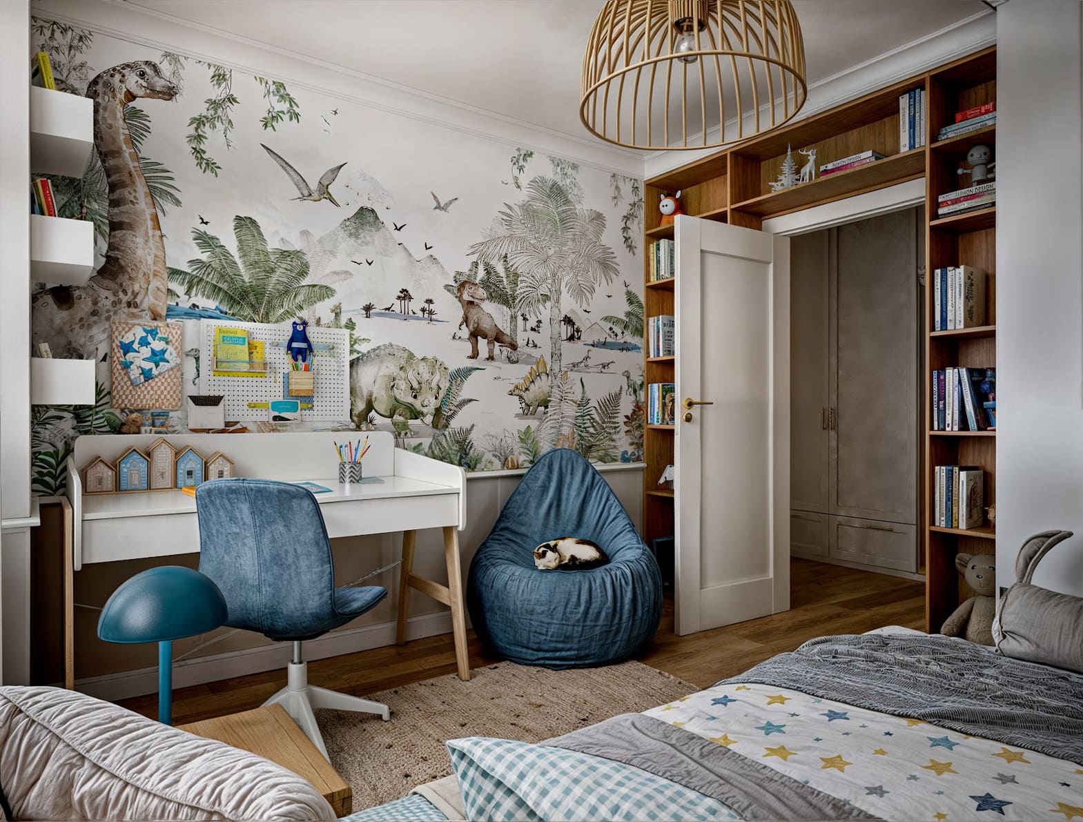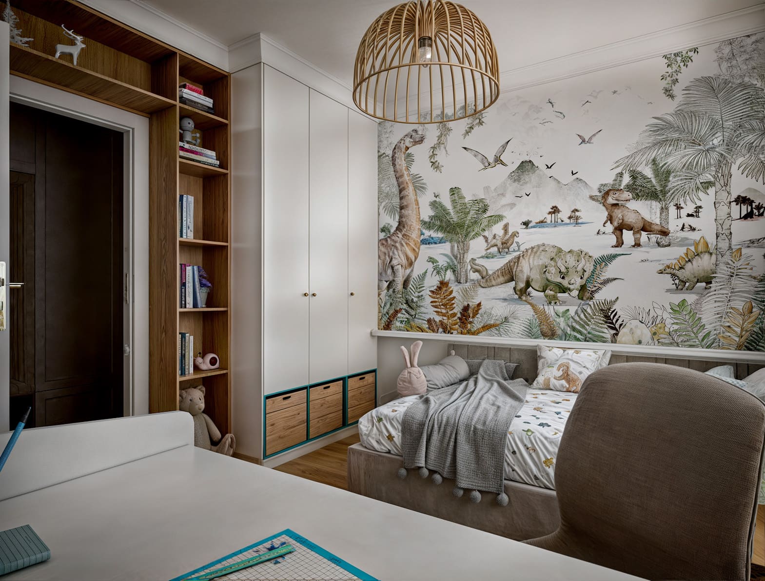 Każde dziecko to mały odkrywca, dlatego ich pokoje zostały zaplanowane tak, aby wspierać rozwój i pobudzać wyobraźnię. Barwne akcenty, funkcjonalne meble i kąciki do zabawy zachęcają do twórczej aktywności. Bezpieczeństwo było priorytetem — stabilne regały, zaokrąglone krawędzie i odpowiednie oświetlenie zapewniają komfort i swobodę podczas codziennych przygód.