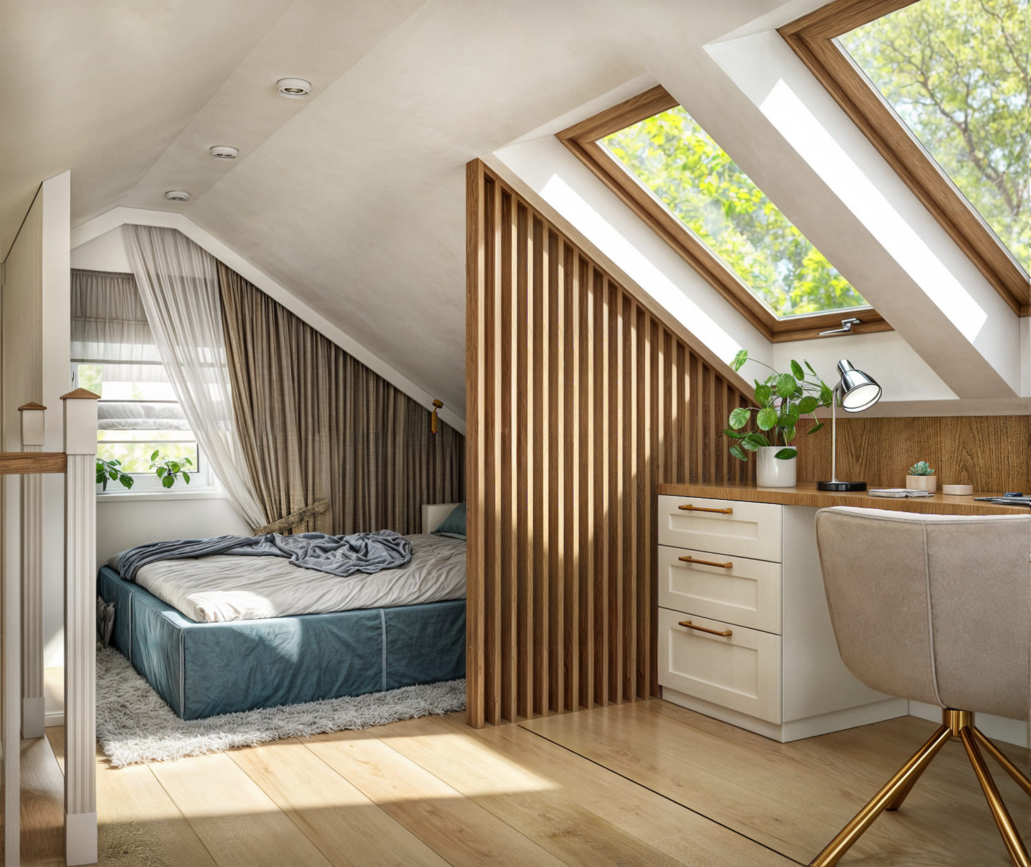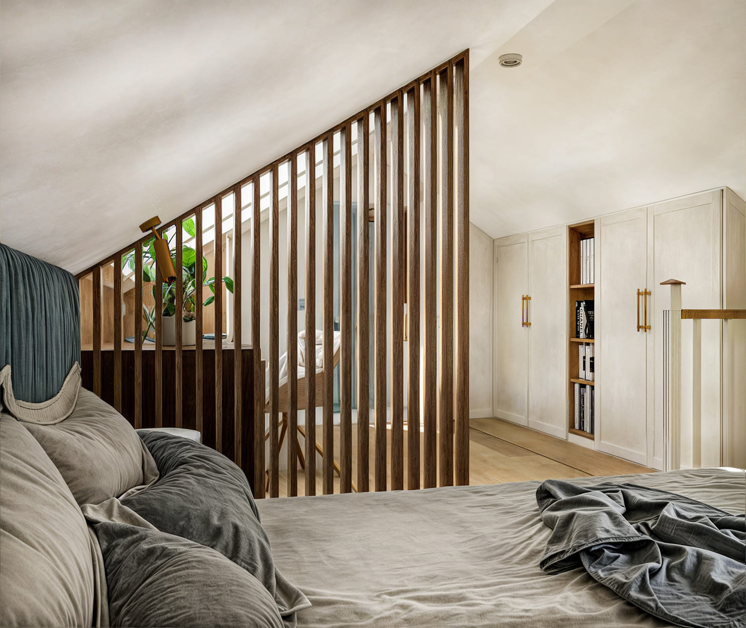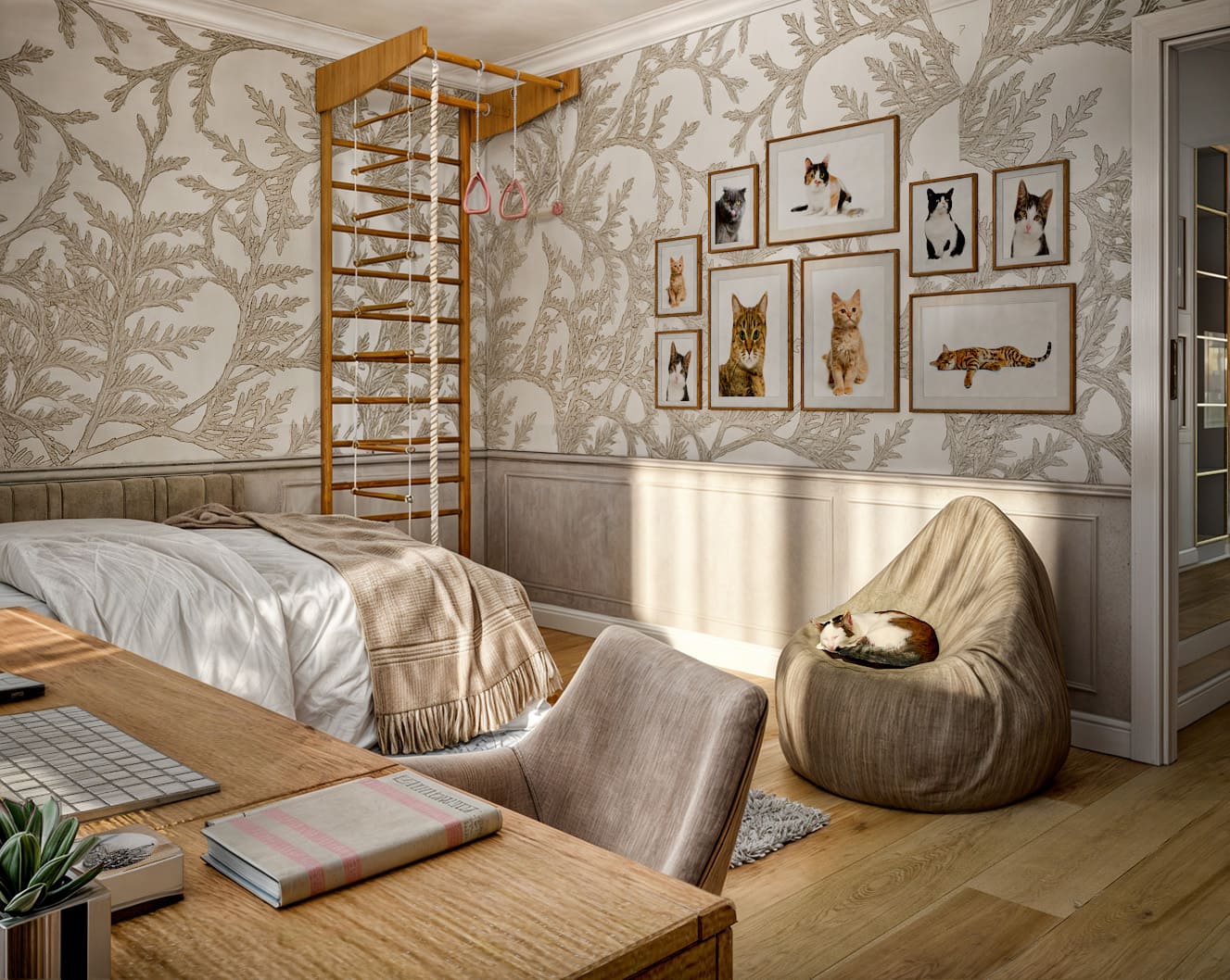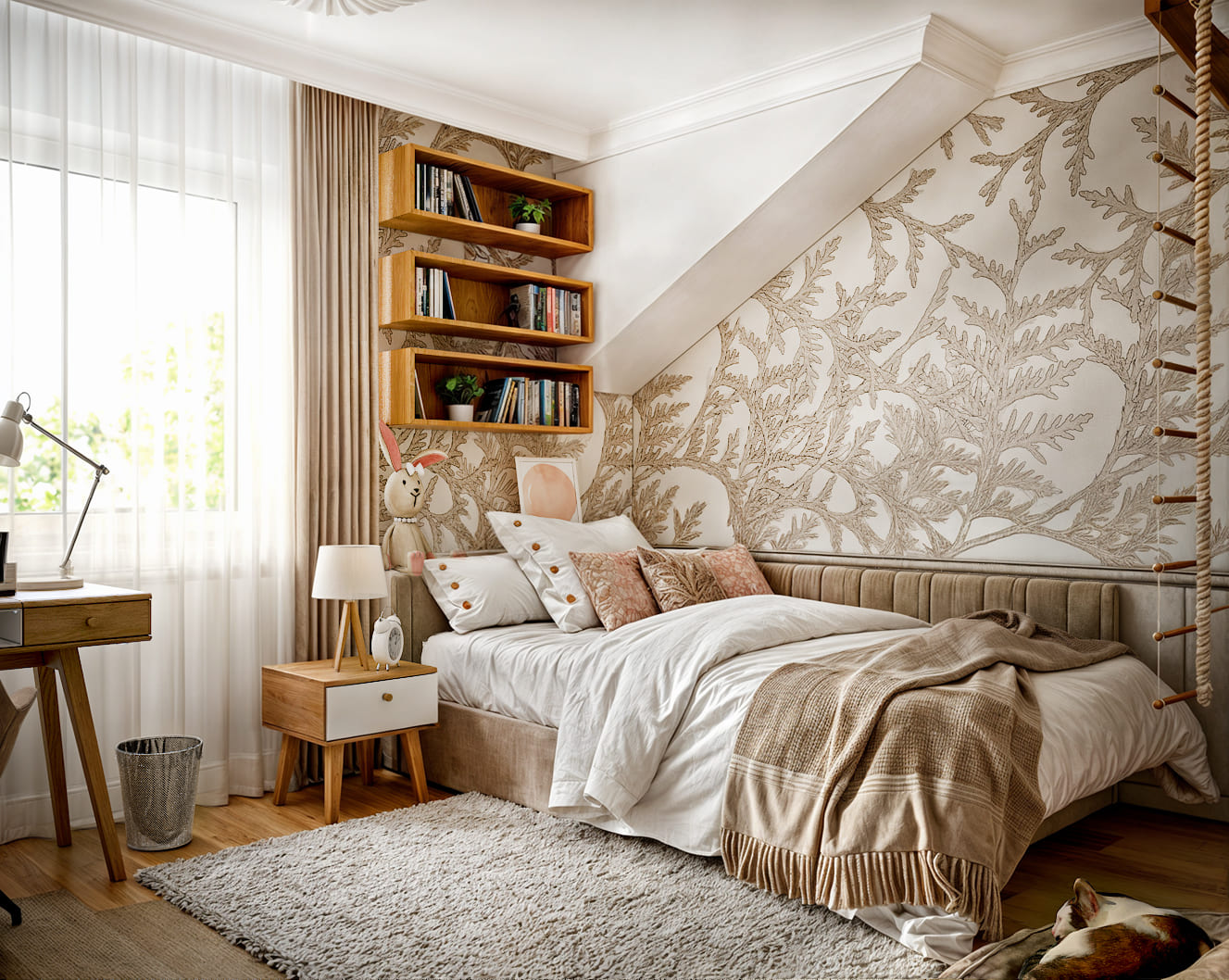 Każde dziecko to mały odkrywca, dlatego ich pokoje zostały zaplanowane tak, aby wspierać rozwój i pobudzać wyobraźnię. Barwne akcenty, funkcjonalne meble i kąciki do zabawy zachęcają do twórczej aktywności. Bezpieczeństwo było priorytetem — stabilne regały, zaokrąglone krawędzie i odpowiednie oświetlenie zapewniają komfort i swobodę podczas codziennych przygód.