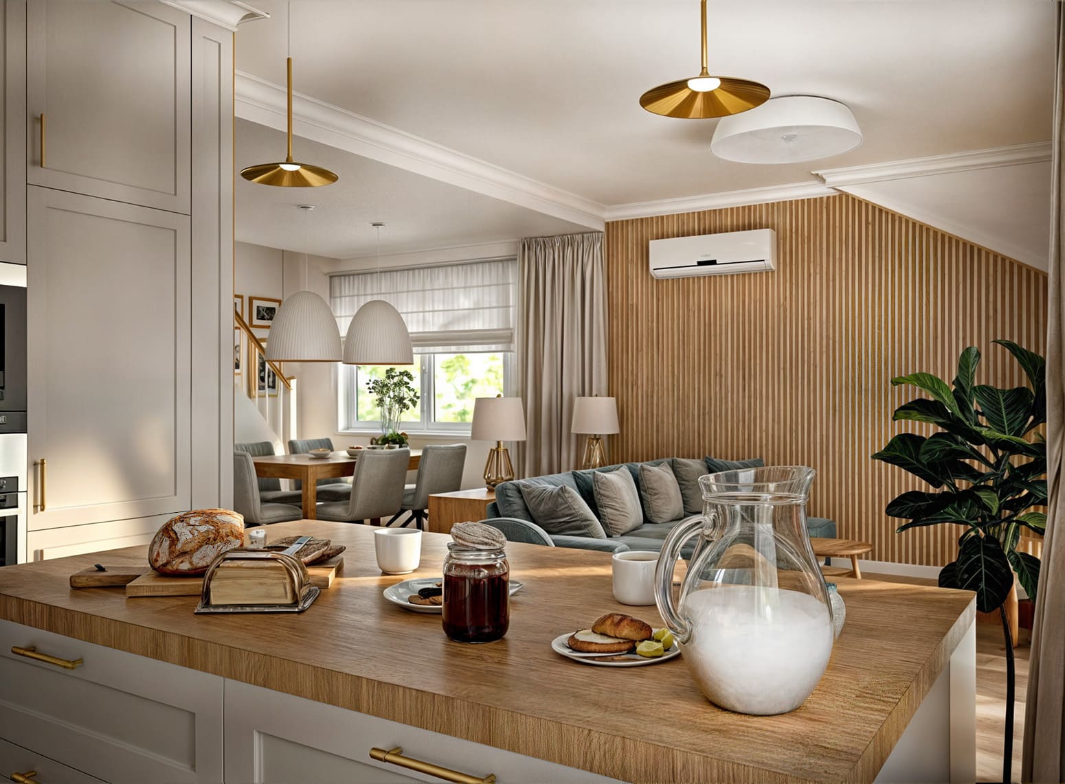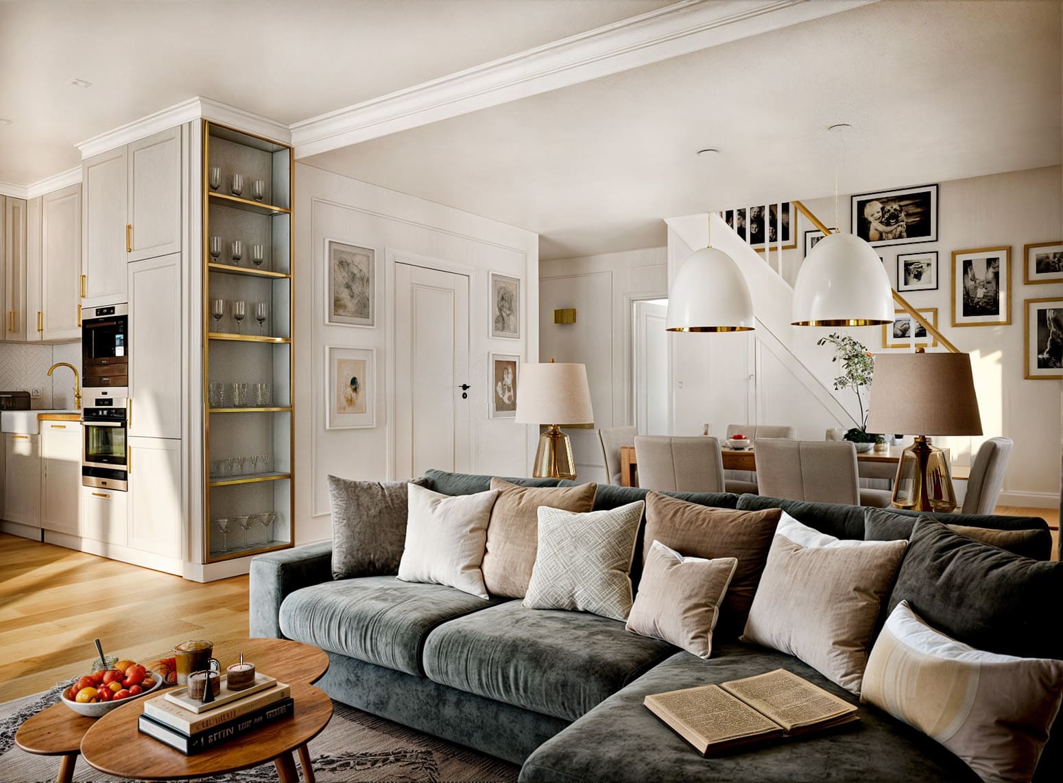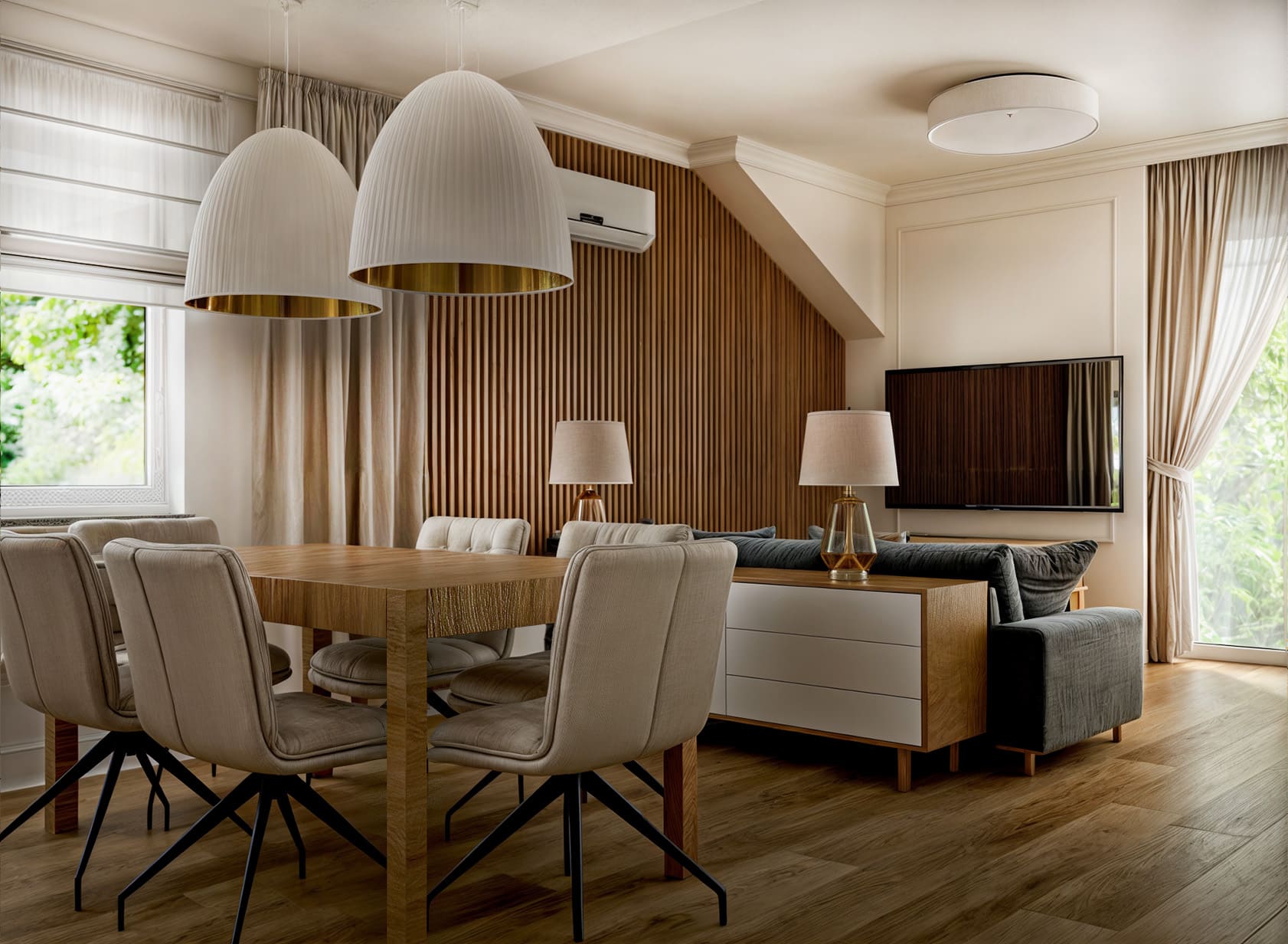 Centralnym punktem mieszkania stała się przestrzeń łącząca salon, jadalnię i kuchnię. Taki układ sprzyja integracji — pozwala na rozmowy podczas przygotowywania posiłków, wspólne śniadania czy leniwe popołudnia przy herbacie. Naturalne materiały, takie jak drewno dębowe, nadają wnętrzu ciepła, a miękkie tkaniny i dodatki w stonowanych barwach tworzą atmosferę spokoju. Przemyślane oświetlenie oraz wygodne meble zapraszają do odpoczynku i wspólnych rozmów.